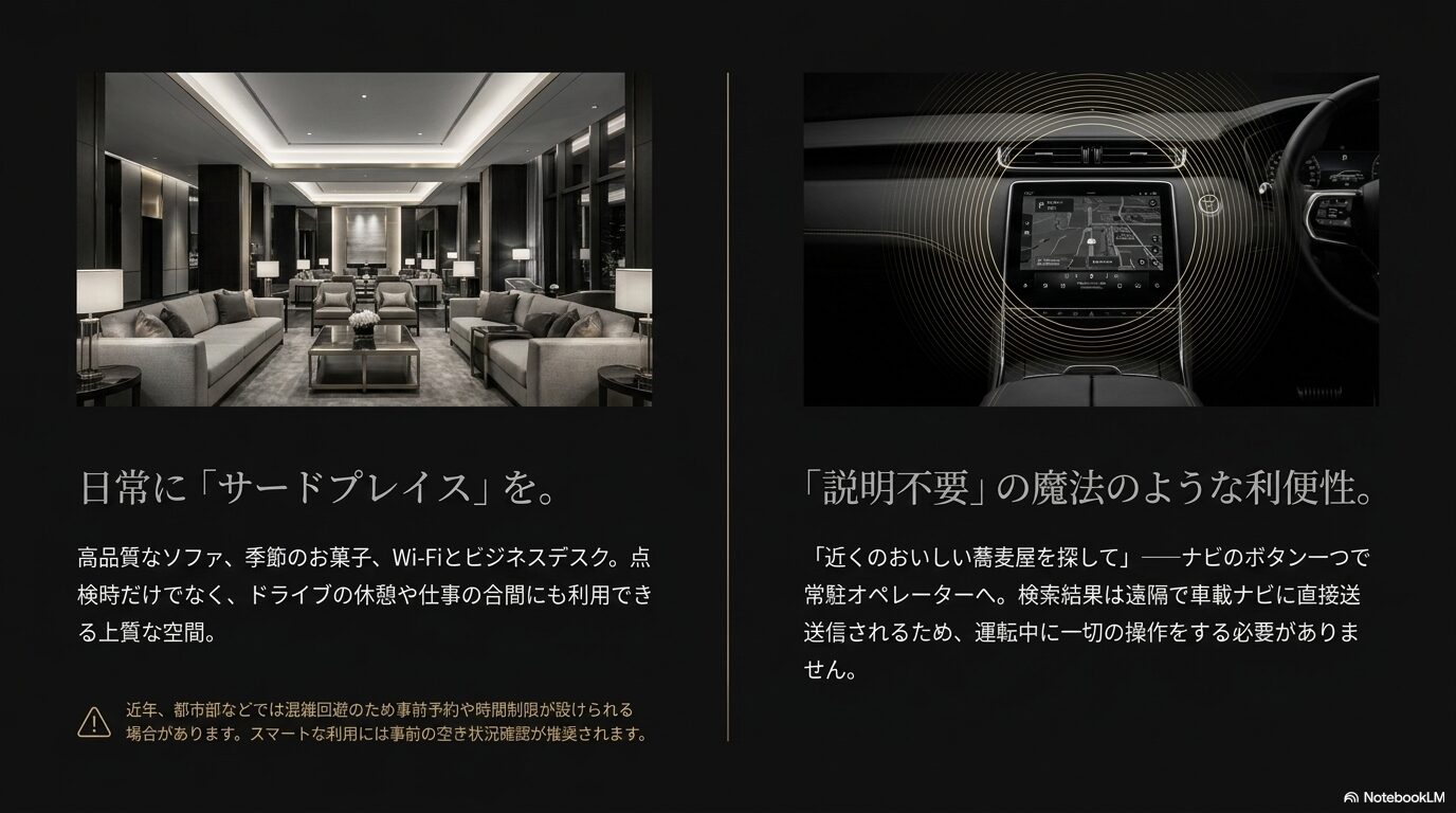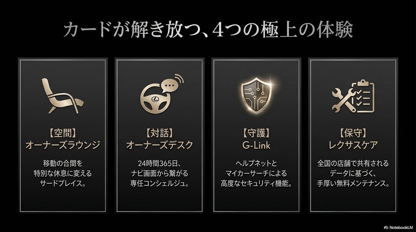 レクサスオーナーズカードは、単なるプラスチックのカードではなく、レクサスが追求する「おもてなし」の精神が形になったものです。このカードがあることで、日々のドライブはより安心なものになり、移動の合間のひとときが特別な休息へと変わります。