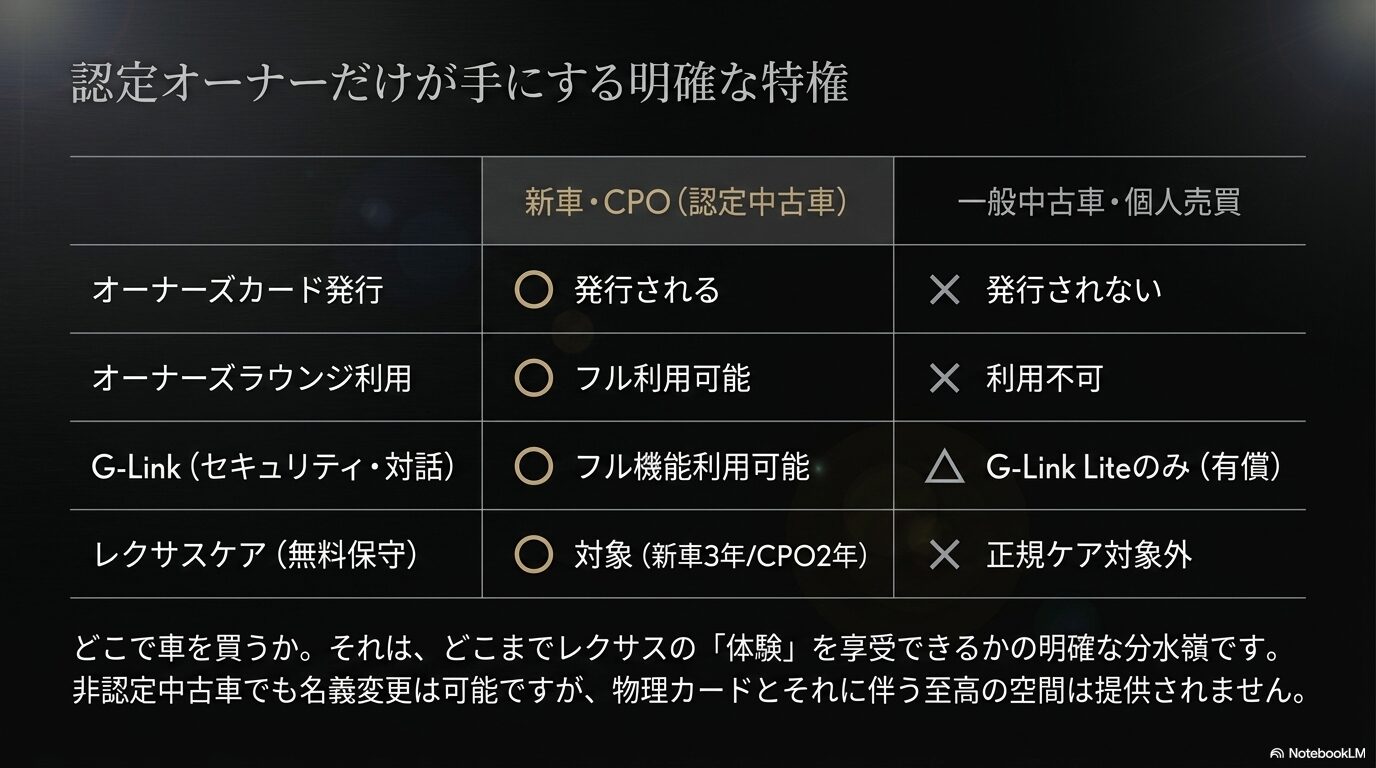 残念ながら、一般的な中古車店や個人売買で購入した車両の場合は、レクサス店で名義変更の手続きを行っても、この物理的なカードが発行されることはありません。レクサスが提供するフルスペックのサービスを享受できるかどうかは、購入ルートによって明確に分けられているのが現状ですね。