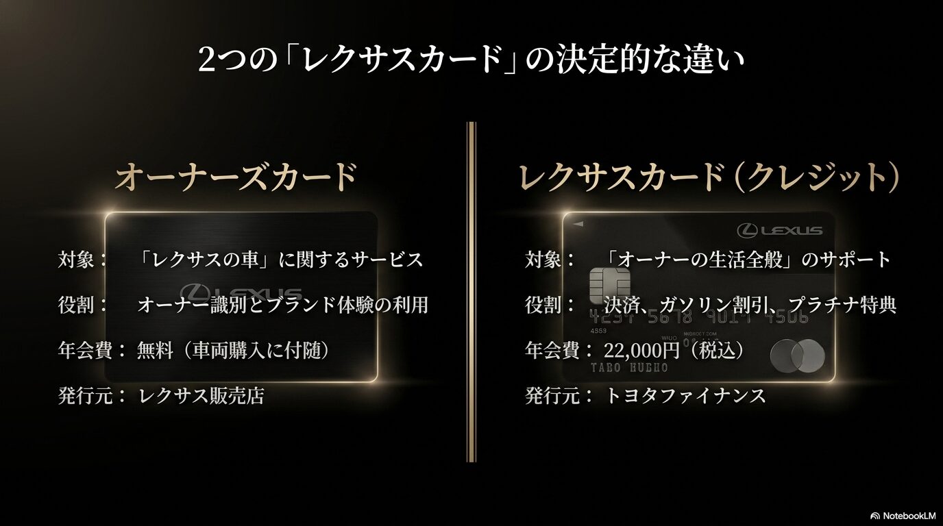 よく混同されやすいのが、磁気カードの「レクサスオーナーズカード」と、クレジットカードである「レクサスカード」です。これらは全く別のものですので、違いを整理しておきましょう。