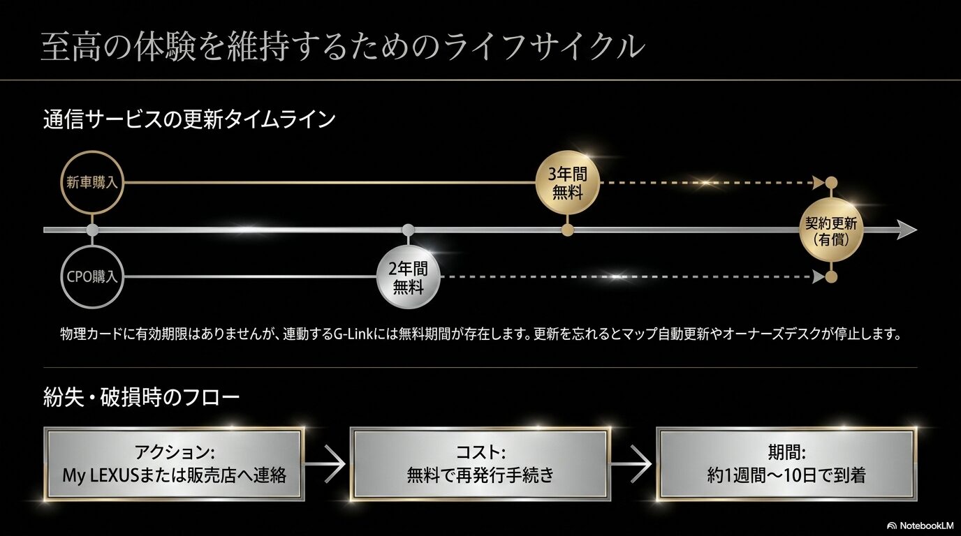 更新を忘れると、マップの自動更新やオーナーズデスクの接続ができなくなってしまいます。サービスを継続するかどうかは自由ですが、レクサスの利便性を維持するためには更新を検討するのが一般的かなと思います。なお、通信契約が切れていても、カードによるラウンジ利用は継続できることが多いですが、詳細は各販売店に確認してくださいね。